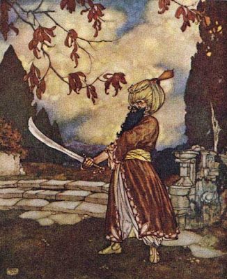 Com espadas ensaguentadas, os irmãos da mulher de Barba Azul perseguem-no escada abaixo e o matam. Na luta, Barba Azul perdeu seu turbante (TATAR, 2004, p.157).